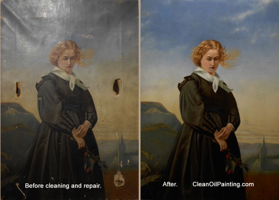 The circa 1865 oil painting above had multiple tears and scrapes, along with a thick layer of grime.